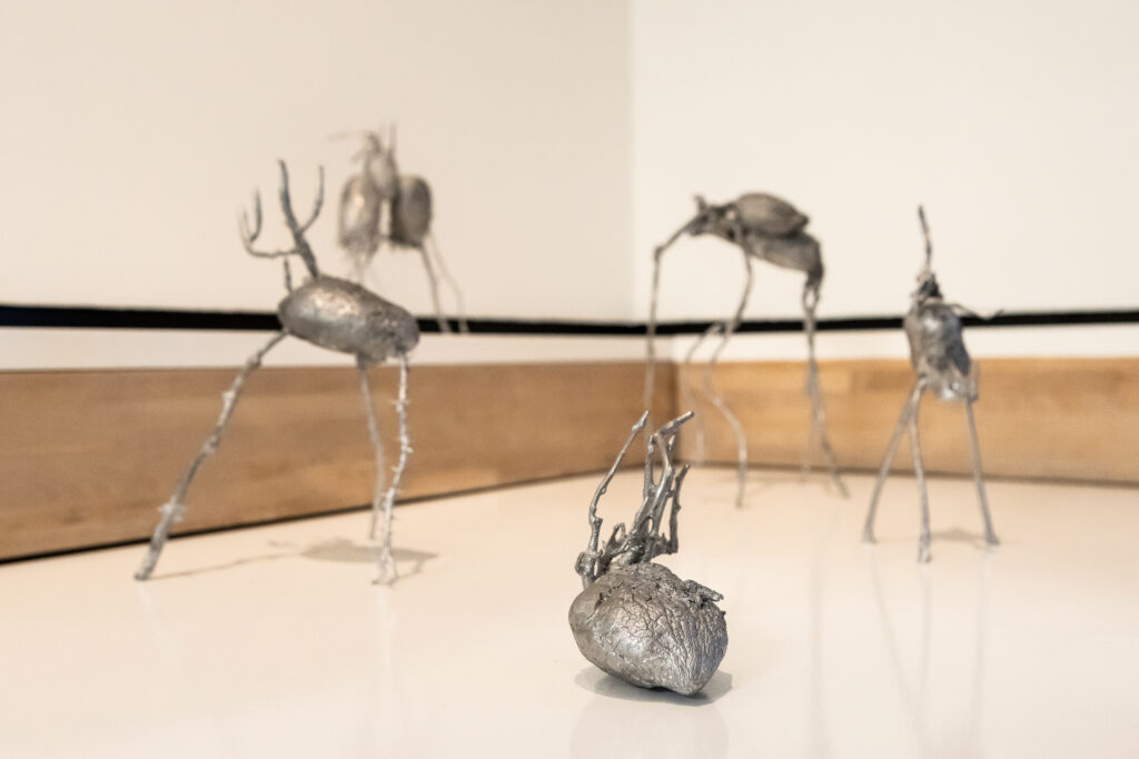 More speculative connections can be made between Remi Jabłecki and Radovan Kraguly’s practices. The former’s futuristic sculptures remind us of the otherworldly, even alien qualities of these most earthly and everyday British crops, with the artist using them as a means to think about transformation and personal growth. Kraguly’s prints, though as detailed as scientific and botanical illustrations, are similarly cosmic, avoiding categorisation in their ambiguous representations and titles. Reflecting on relations of control between humans and nature, his works also illustrate the role of different pastoral and agricultural environments in the formation of the artist’s own identity and early adoption of ‘climate politics’, connecting his formative experiences growing up on a farm in the former Yugoslavia, to his later practice in rural Wales.
